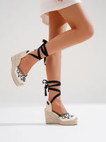 - Esparto wedges tied with braided cord, with strappy vamp and open toe.